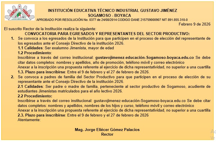 * Articulos recientes * CONVOCATORIA PARA EGRESADOS Y REPRESENTANTES DEL SECTOR PRODUCTIVO 2026 > 2026/02/26 Elecciones Gobierno escolar 2026 > 2026/02/26 HORARIO DE ATENCIÓN A PADRES 2026 > 2026/02/18 INICIO DE CLASES AÑO 2026 > 2026/01/16 Matriculas extemporáneas enero 2026 > 2026/01/13 Fin Articulos Recientes |
